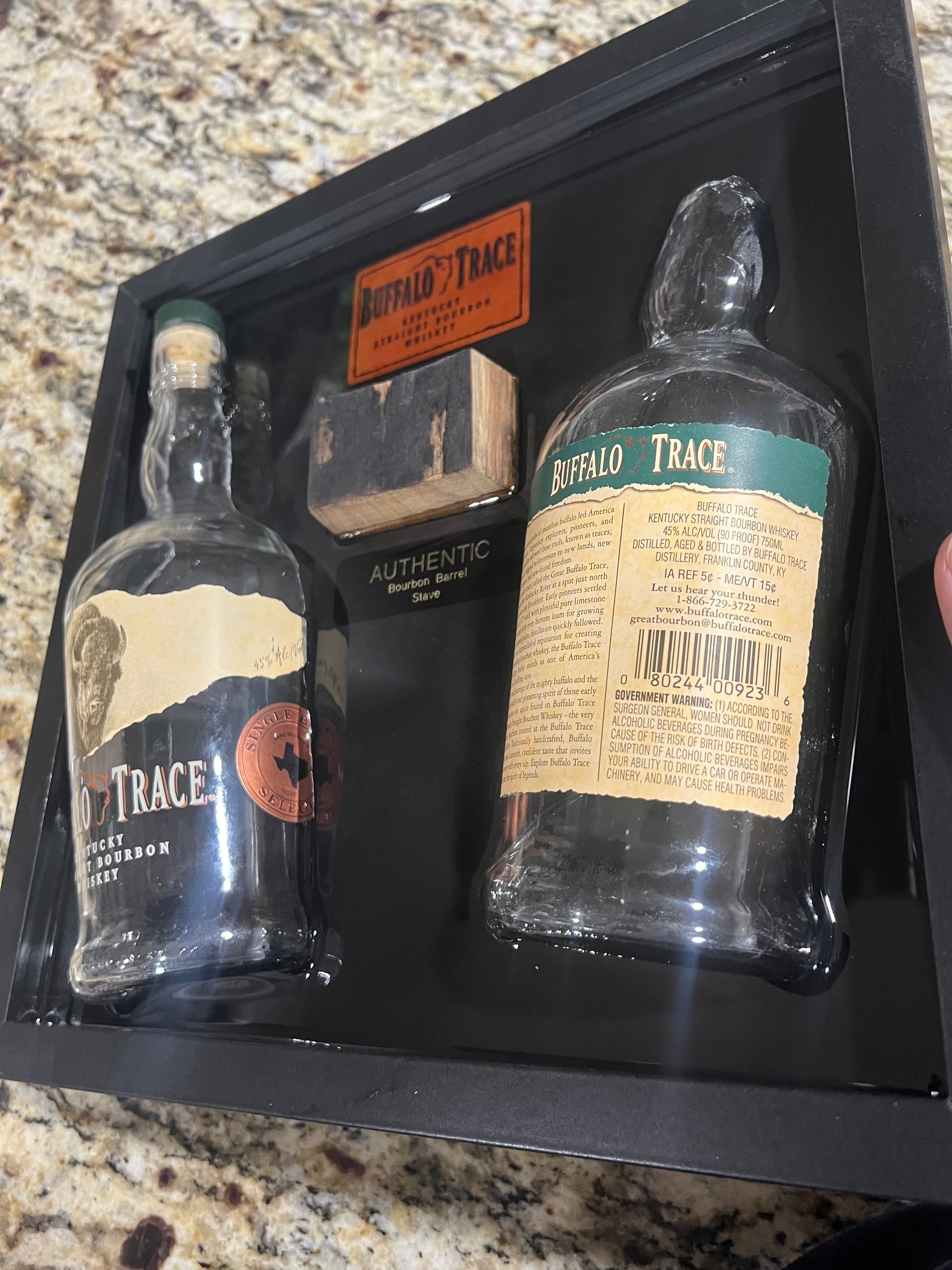 Buffalo Trace Bourbon 12” x 12” Broke Bottle Art Epoxy Shadow Box w/Bourbon Barrel Stave