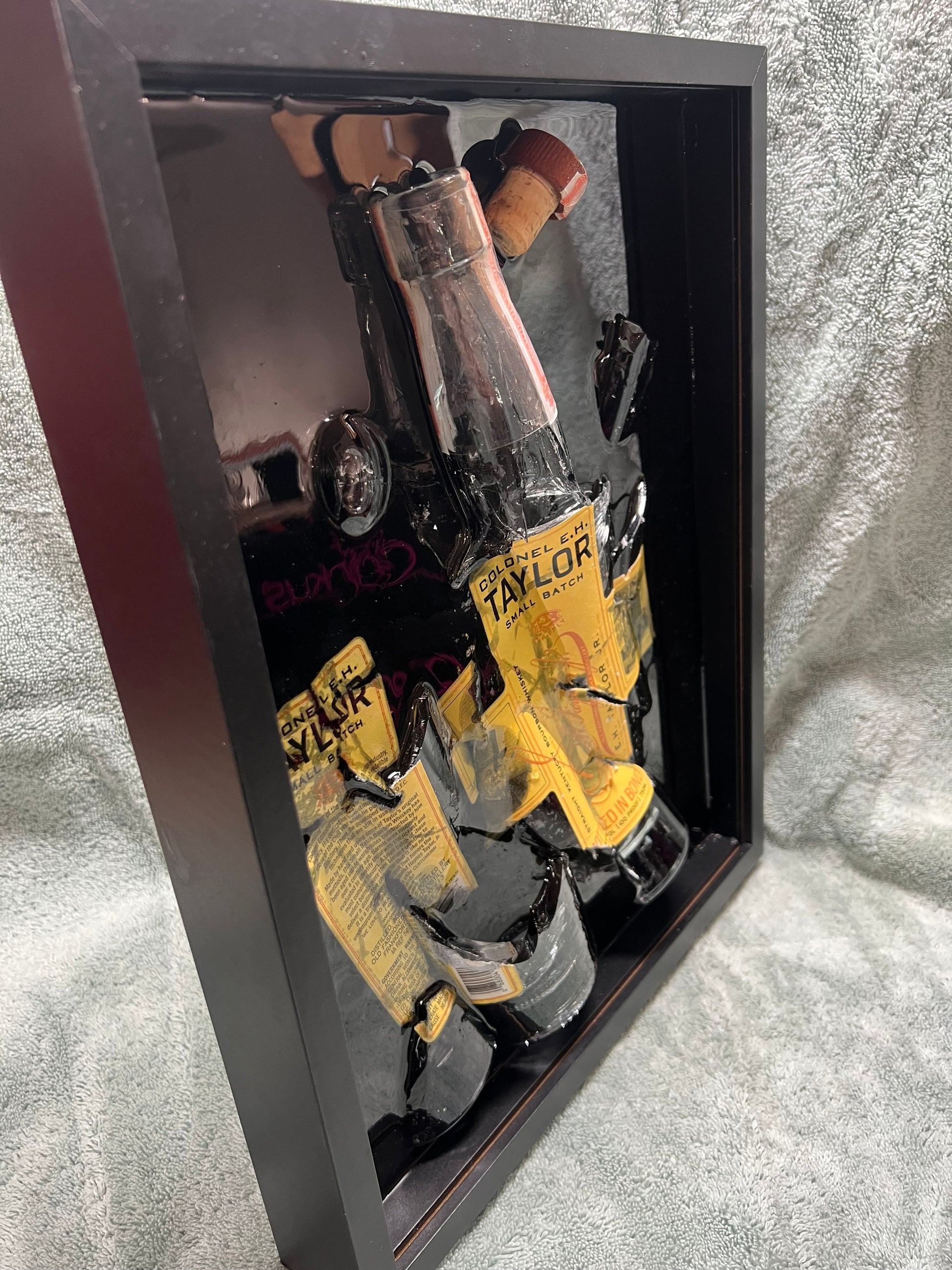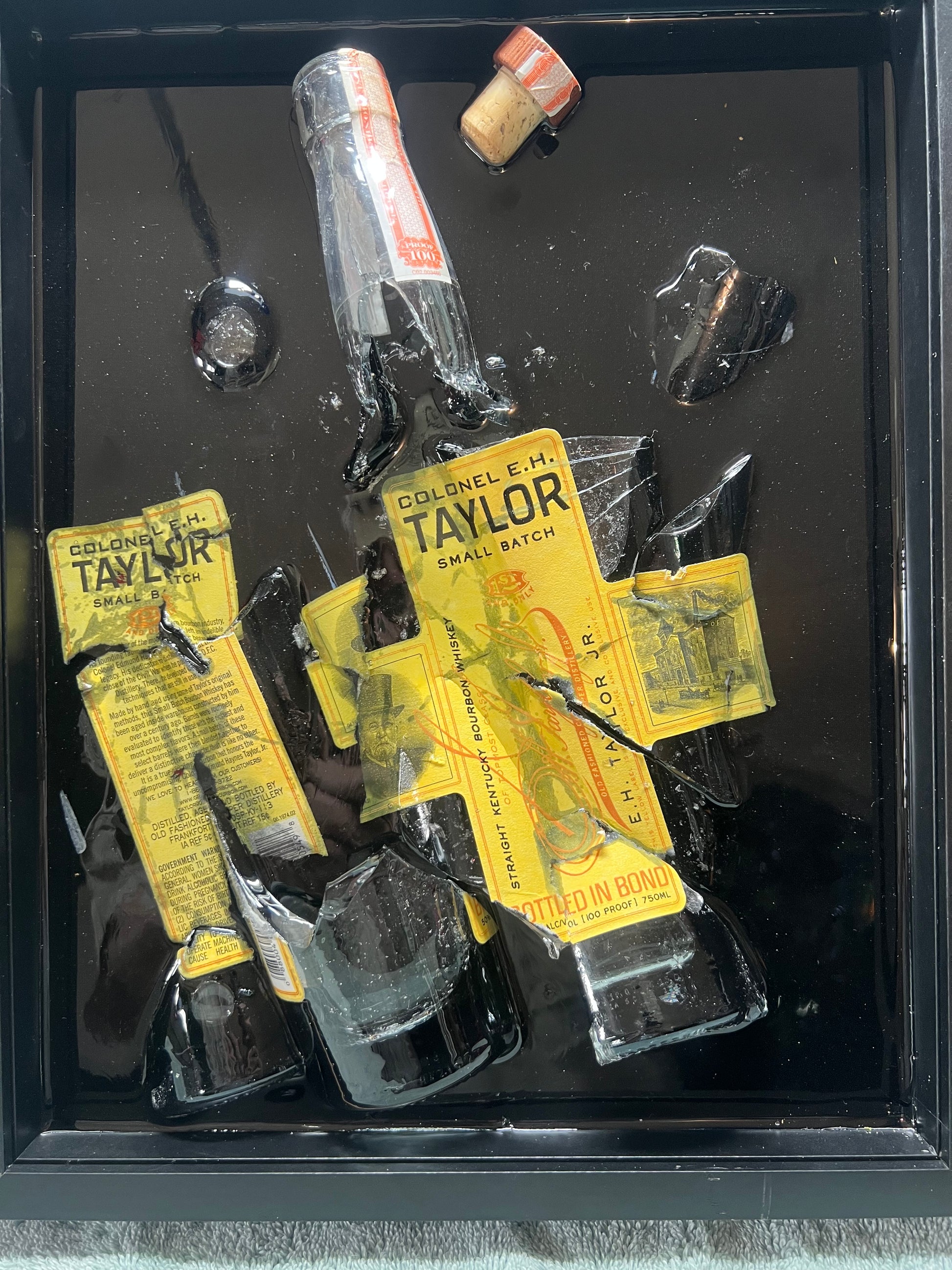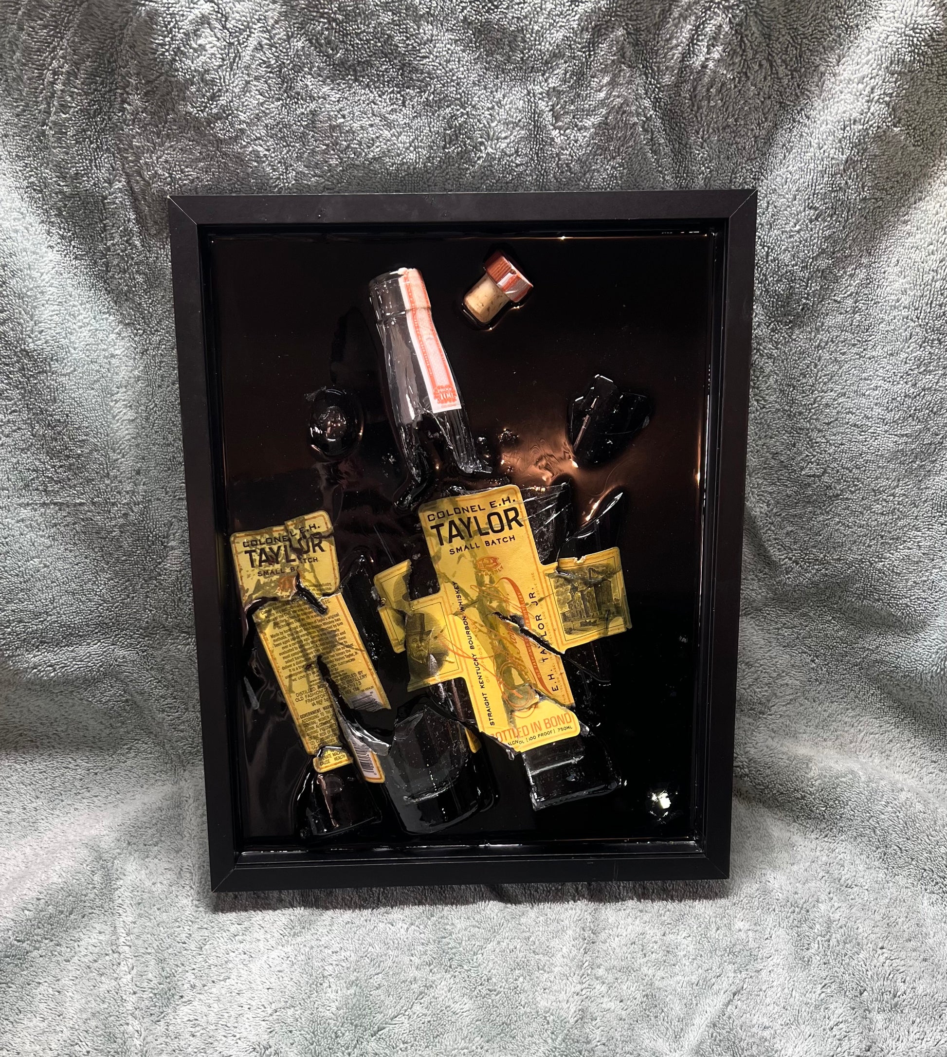 EH Taylor Single Barrel Bottle in Bond Bourbon 12” x 14” Broke Bottle Art Epoxy Shadow Box